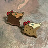 1-inch bear head cloisonné pin in gold metal with dark brown, tan, and red glitter enamel.